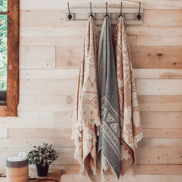 Serviette jacquard double épaisseur et réversible de POKOLOKO. Multifonctionnelle, d'une dimension généreuse adaptée pour le bain, la plage, en écharpe ou pour le voyage.