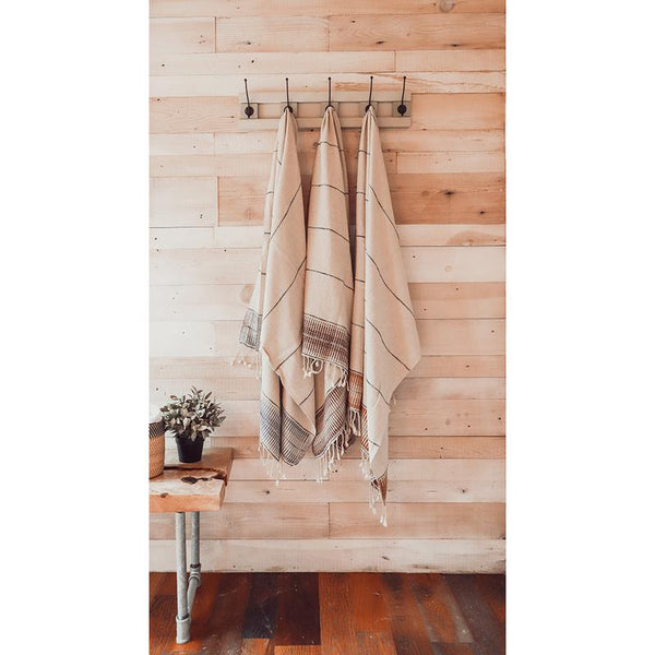 Serviette unique de POKOLOKO, avec une couleur de fond beige astucieuse et une frange à pampilles torsadées. Il s'agit d'un textile multifonctionnel aux dimensions généreuses, adapté au bain, à la plage, en écharpe et aux voyages.