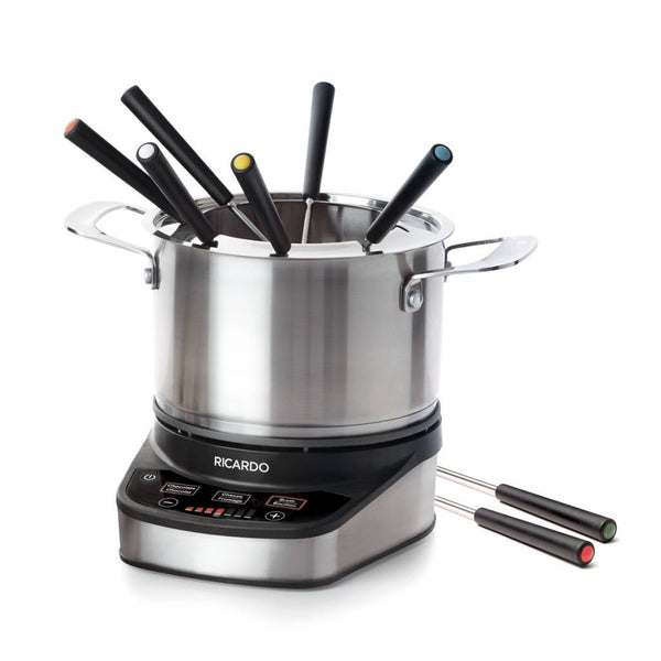 Faites de vos soupers de fondue un succès assuré grâce à cet ensemble à fondue électrique de RICARDO. Doté de fonctions préprogrammées, il permet un contrôle précis de la température des bouillons, des fondues au fromage et des fondues au chocolat, et ce, tout au long du repas. À la fois pratique et sécuritaire, l’ensemble inclut huit fourchettes de différentes couleurs et un élégant support chromé au look contemporain.