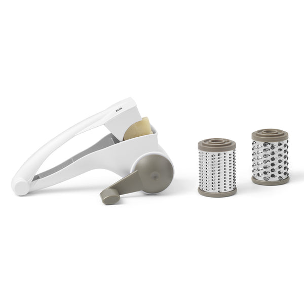 Cet ustensile est sécuritaire pour les doigts et fonctionne avec deux barils interchangeables dotés de lames en acier inoxydable. L’un convient aux râpures fines, l’autre aux râpures plus grossières. Tous deux offrent d’excellents résultats non seulement avec les fromages, mais aussi avec d’autres aliments comme les noix, l’ail, le gingembre, le chocolat, etc.