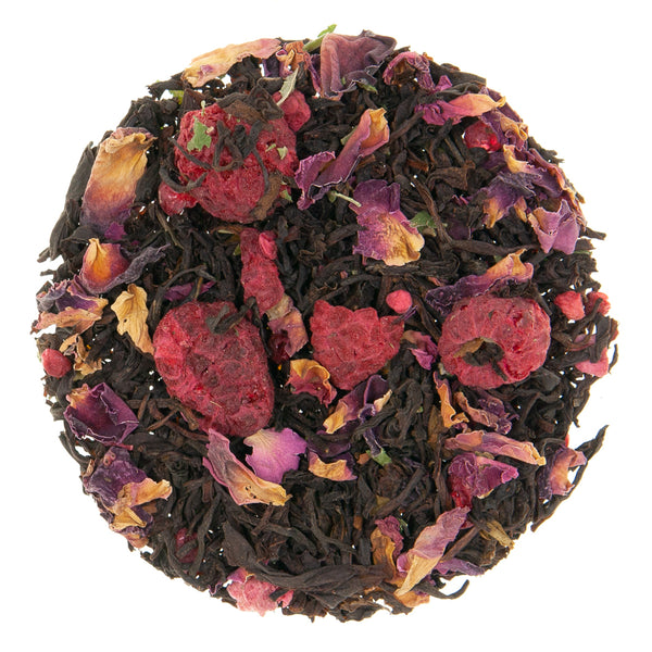 Thé noir, feuilles de mûres, pétales de rose, morceaux de framboise, arômes naturels