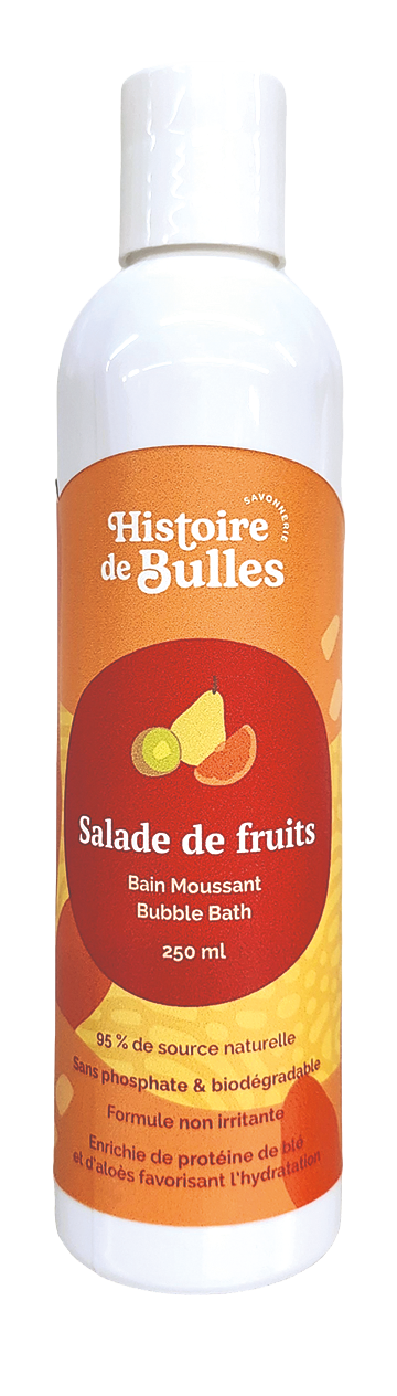 Bain moussant d'HISTOIRE DE BULLES 250ml est enrichie de protéine de blé et d'aloes ce qui favorise l'hydratation. Formule non irritante à 95% de source naturelle. Sans phosphate & biodégradable.