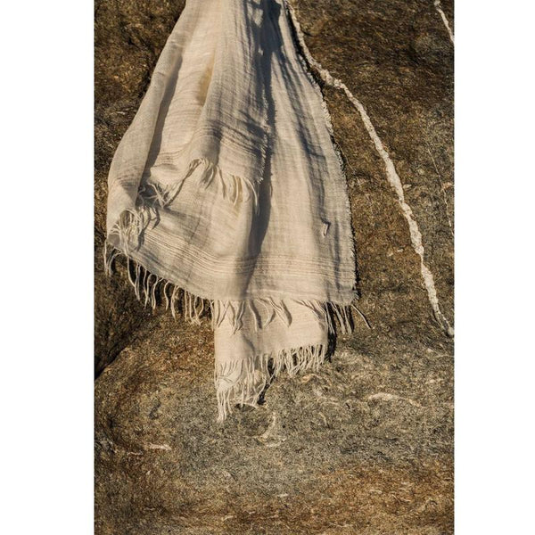 Cette écharpe de POKOLOKO, est un mélange de lin et de coton avec un détail rayé blanc à chaque extrémité. Il s'agit d'une écharpe unique de haute qualité.