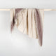 Serviette unique de POKOLOKO, avec une couleur de fond beige astucieuse et une frange à pampilles torsadées. Il s'agit d'un textile multifonctionnel aux dimensions généreuses, adapté au bain, à la plage, en écharpe et aux voyages.