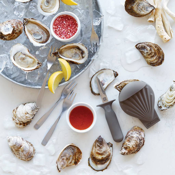 Cet ensemble à huîtres RICARDO a été spécialement conçu pour les amateurs de mollusques ! Il est doté d’un porte-huître pratique muni d’un revêtement antidérapant et d’un protecteur pour les doigts, rendant la manipulation sécuritaire. La lame biseautée du couteau est robuste et permet de s’attaquer facilement aux coquilles d’huître les plus coriaces.
