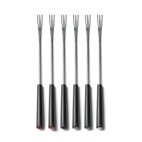 Ces 6 fourchettes à fondue RICARDO sont chacune munies de trois dents en acier inoxydable pour piquer aisément les cubes de pain dans les fondues au fromage ou les morceaux de viande dans les fondues chinoises. Leurs manches résistants à la chaleur sont dotés d’embouts de couleurs distinctes pour que chaque invité ait sa propre fourchette.