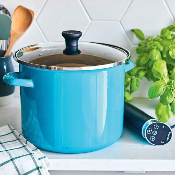 Avec sa surface émaillée qui lui confère une grande résistance, cette marmite RICARDO ne manquera pas d’apporter une touche de couleur à votre cuisine. Son couvercle en verre trempé est muni d’un évent qui a pour fonction de relâcher la vapeur en cours de cuisson. Le format du récipient est idéal pour la cuisson sous vide ou pour la cuisson des homards, du blé d’Inde, des soupes et des ragoûts.